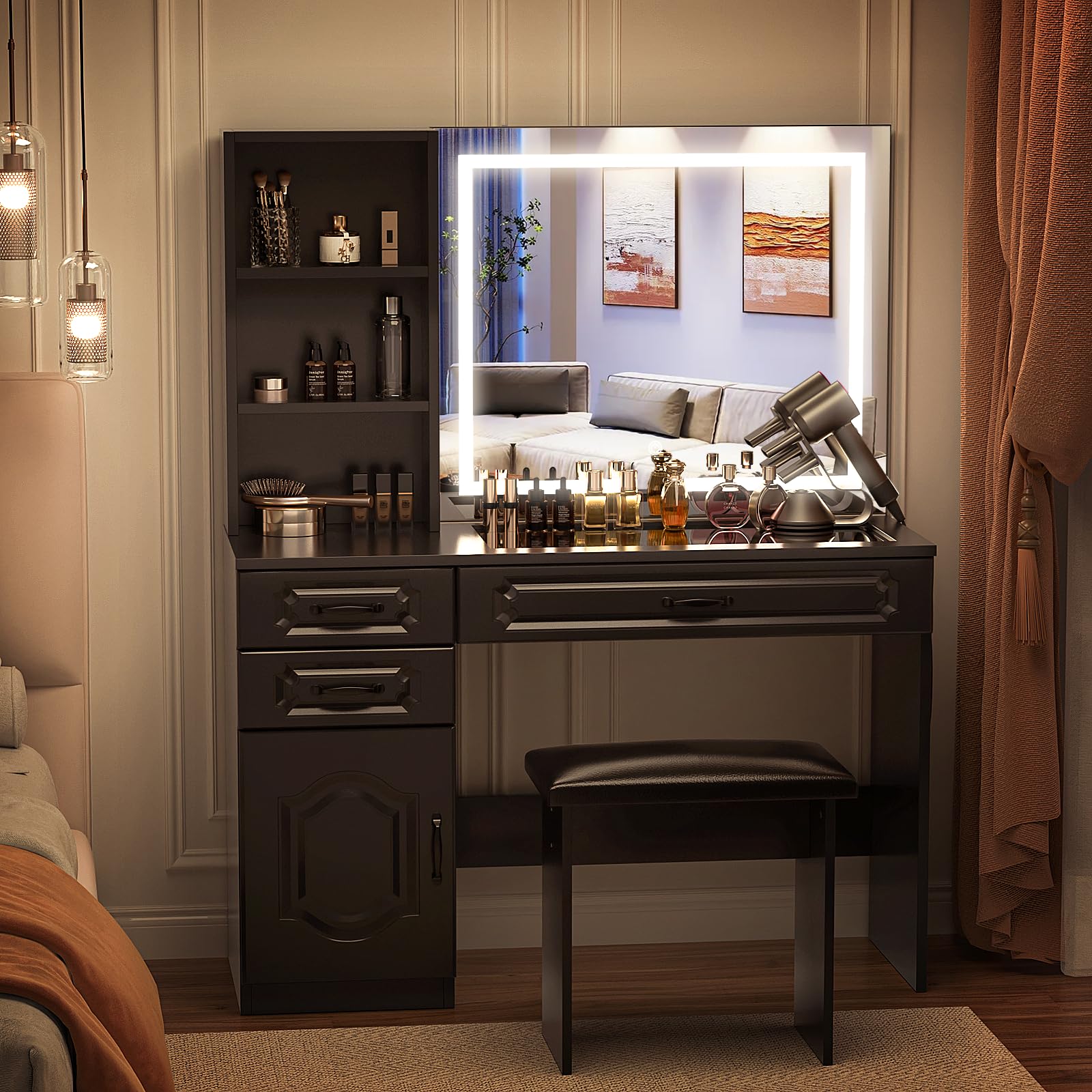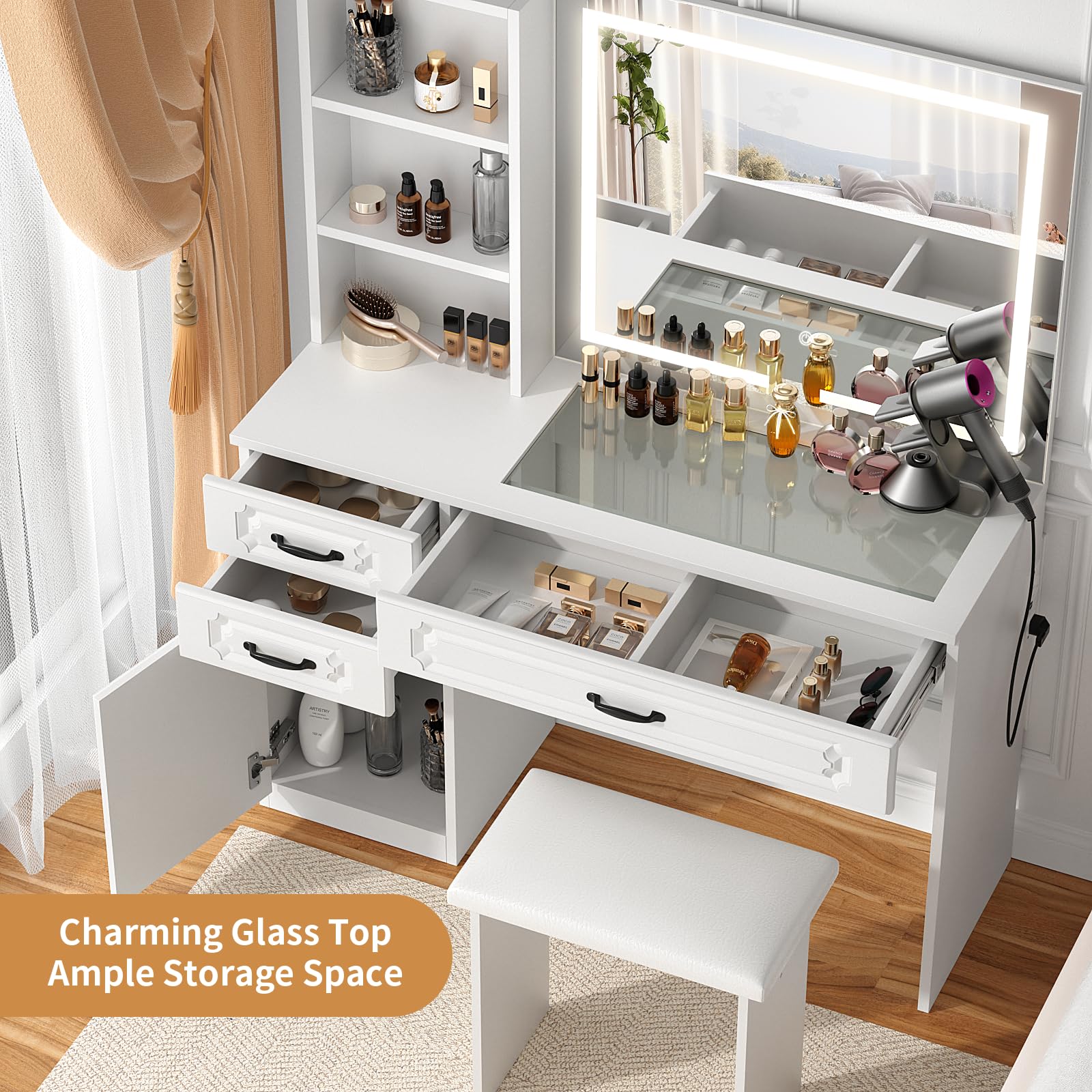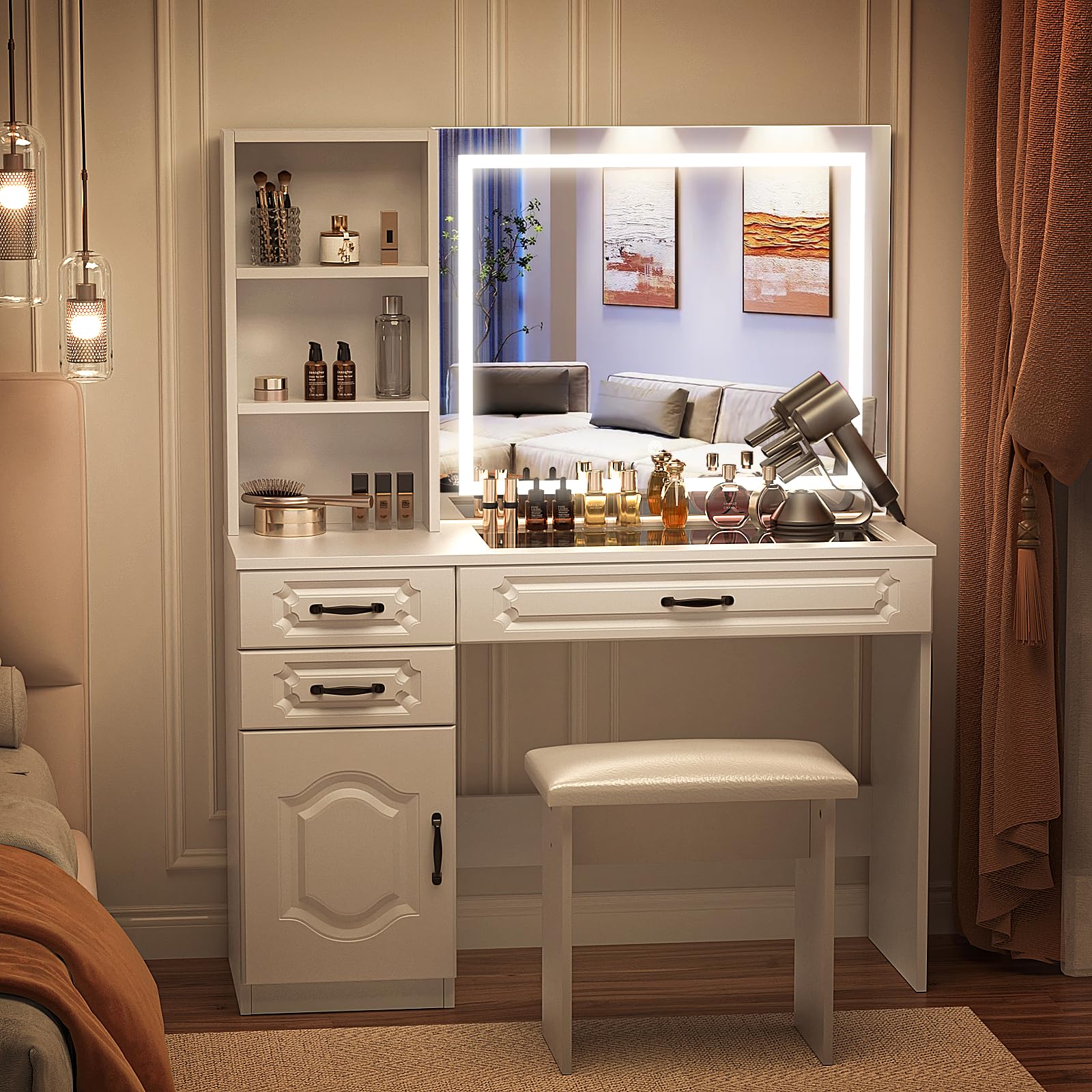 VOWNER Makeup Vanity Desk Set With Outlet, Large LED Lighted Mirror Glass Table Top With 3 Drawer, 1 Cabinet And Shelves, Lighting Brightness & Color Adjustable, Gift For Girls Women